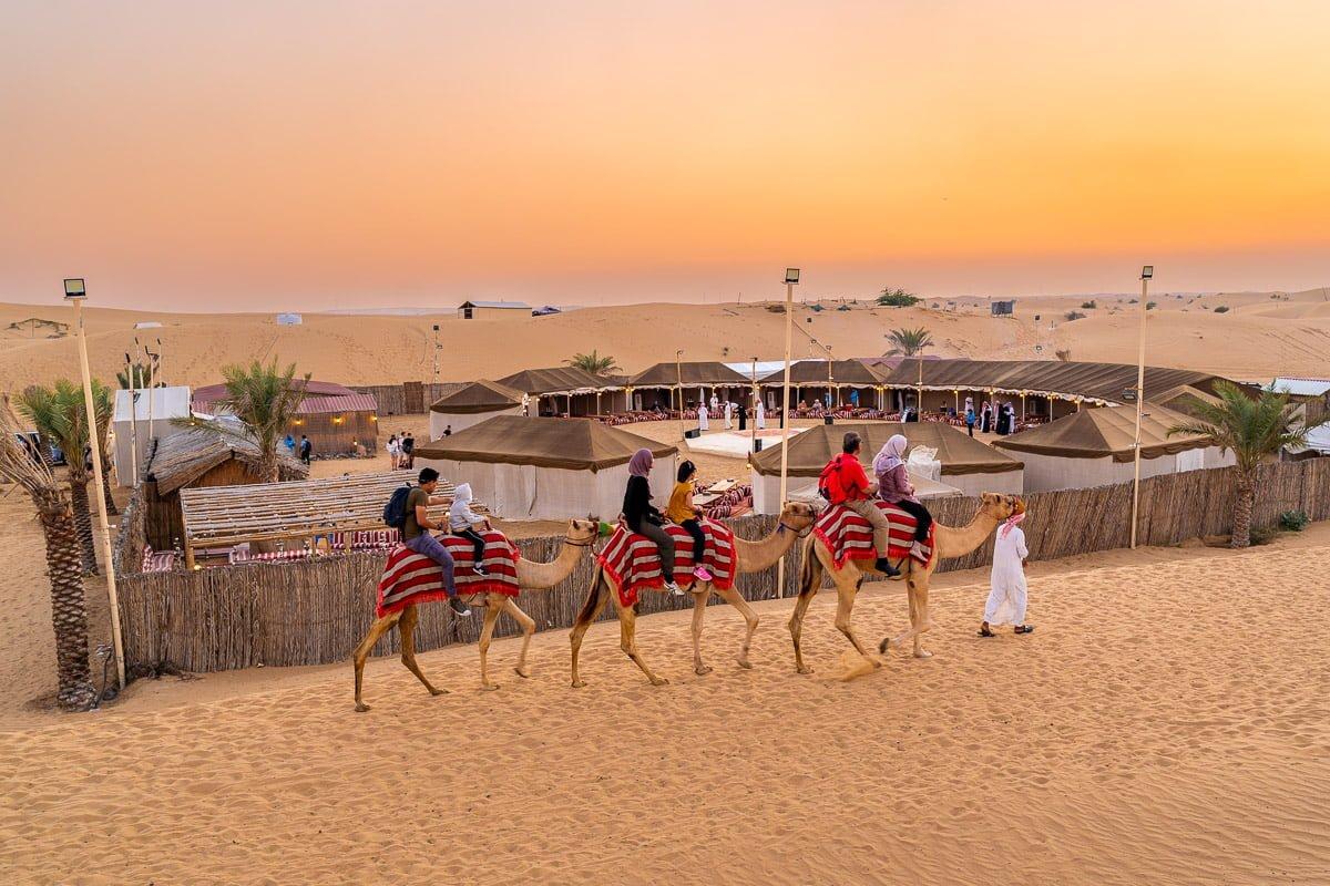 Activities usually include dune bashing, camel riding, sandboarding, cultural performances, and dinner at a desert camp.